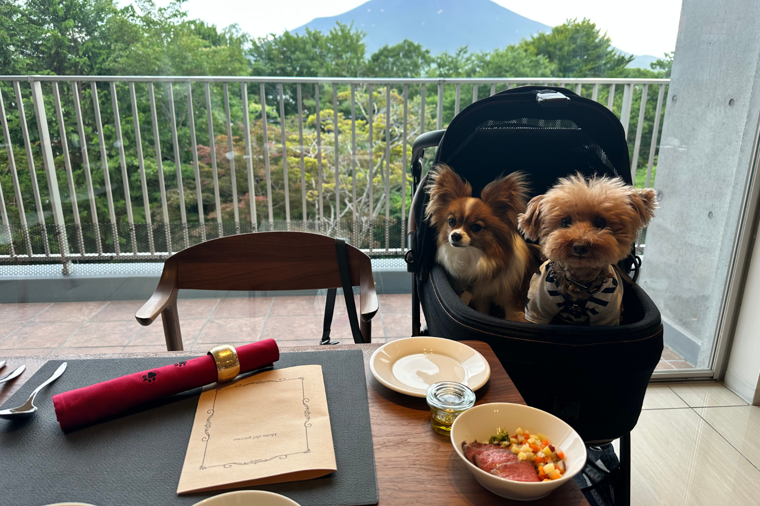 楽しみのお食事は2階のレストランへ。スタッフさんに迎えられお席まで歩いて行くと…目の前には雄大な富士山!“このロケーションで愛犬と食事ができる”。それだけでもここに泊まる価値があると思える素敵な空間が広がっています。