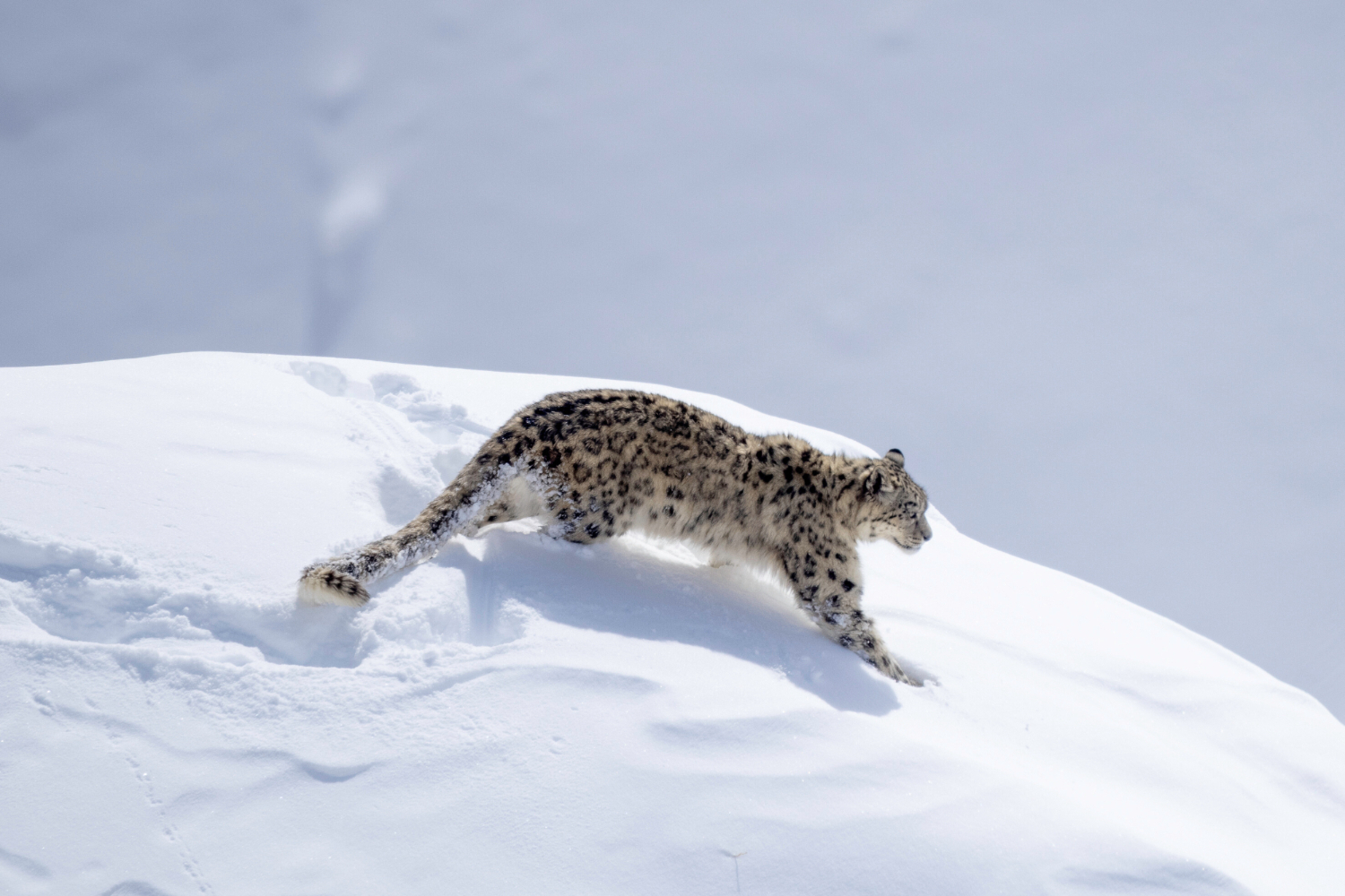 ユキヒョウの体には、高い標高に適応したさまざまな特徴が見られます。山の斜面を軽々と移動できるよう、体にはがっしりした筋肉がついています。また防寒のために全身に長くてやわらかい毛が密集。冬毛は背中側が5cm、お腹側では12cmにもなります。細胞レベルでは、赤血球がほかのネコよりも小さく、ずっと数が多くなっています。空気が薄い高山で吸収できる酸素の量を多くするためです。