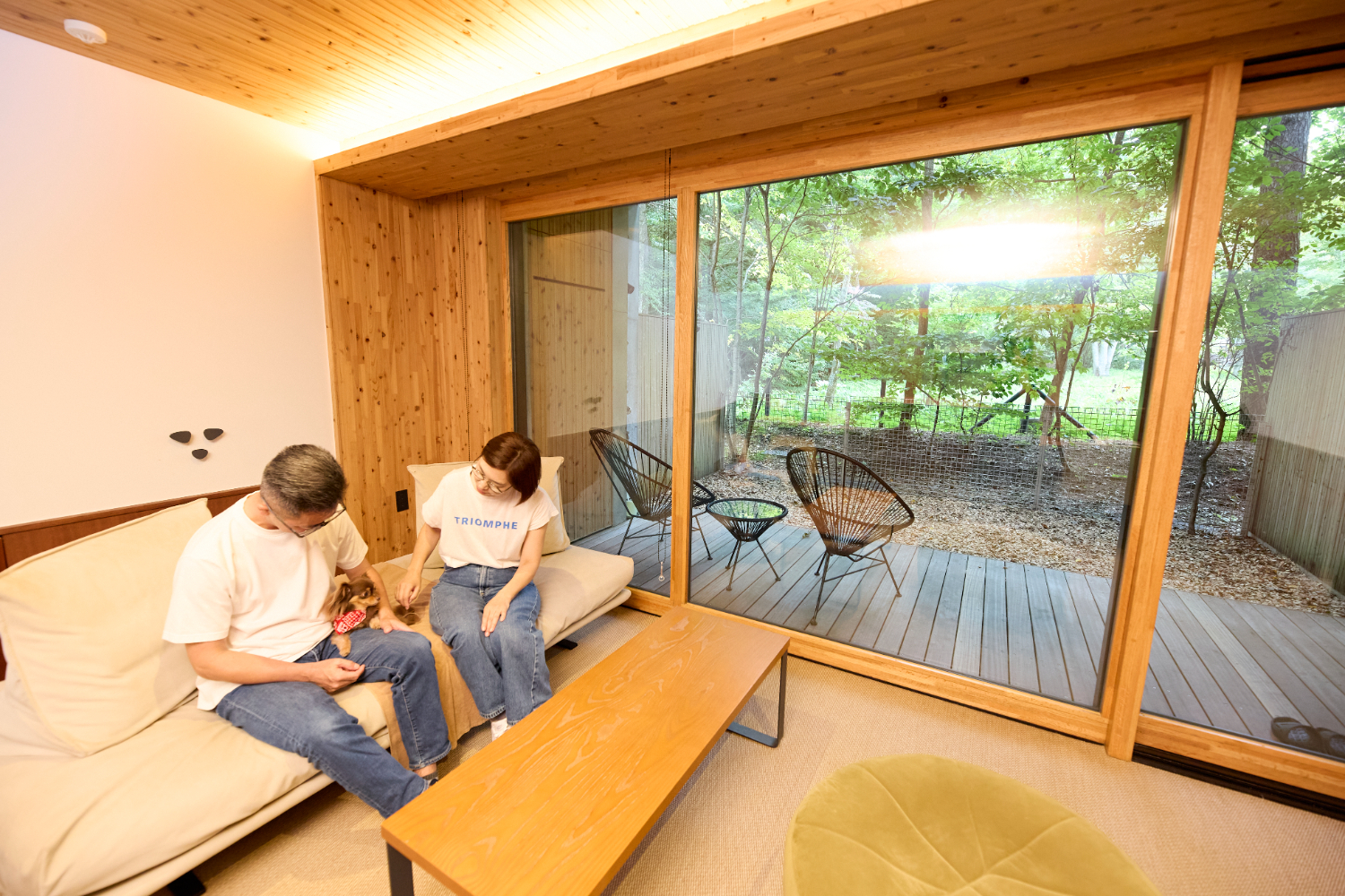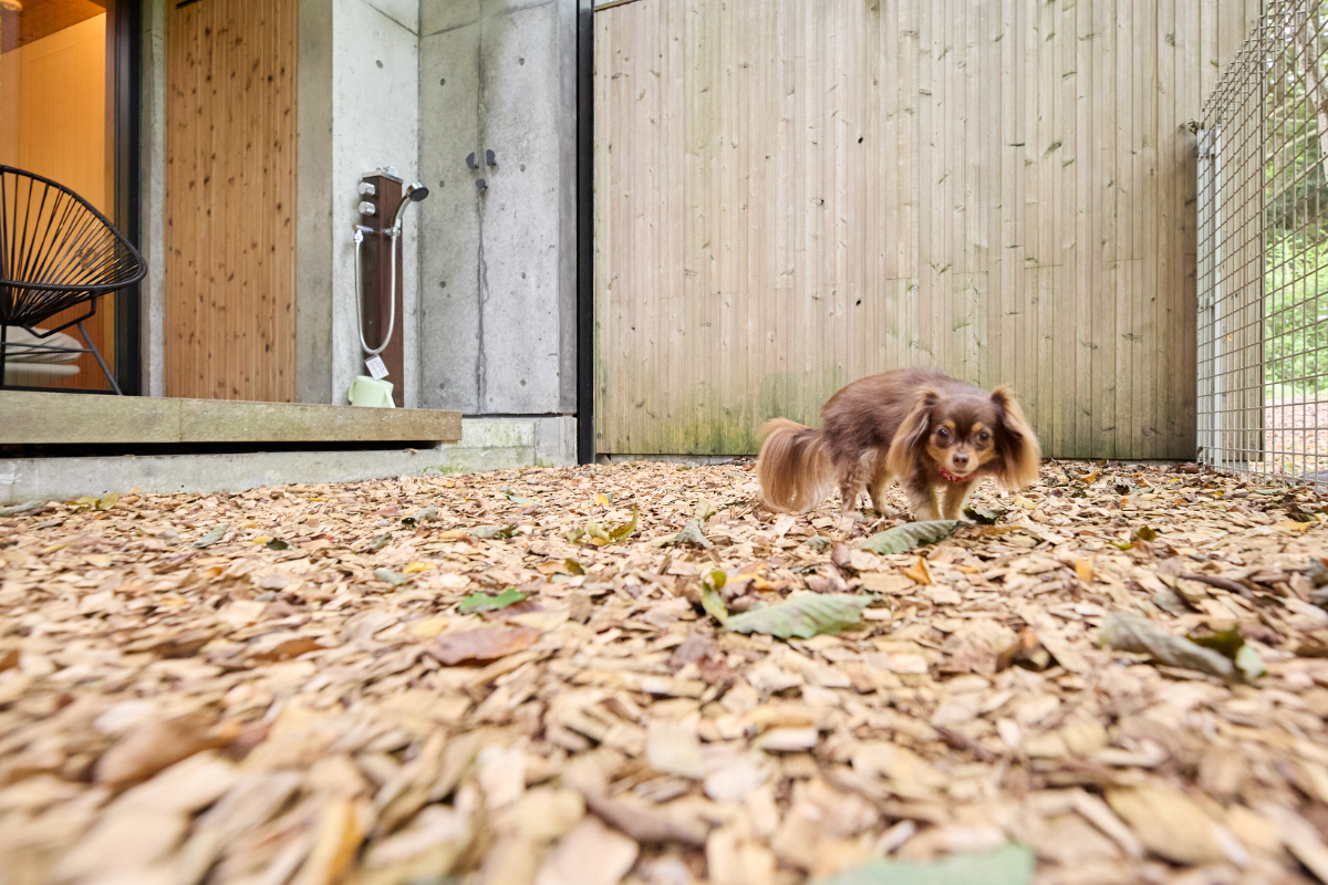 全26室の客室は、1階はウッドチップ敷きのプライベート・ドッグラン付き、2階はテラスから軽井沢の清々しい空気を堪能できるつくり。すべてのお部屋が愛犬にやさしい滑らない床仕様で、愛犬用の衛生用品をはじめとするアメニティも充実しています。
