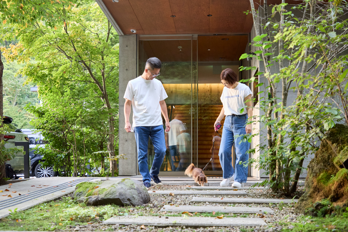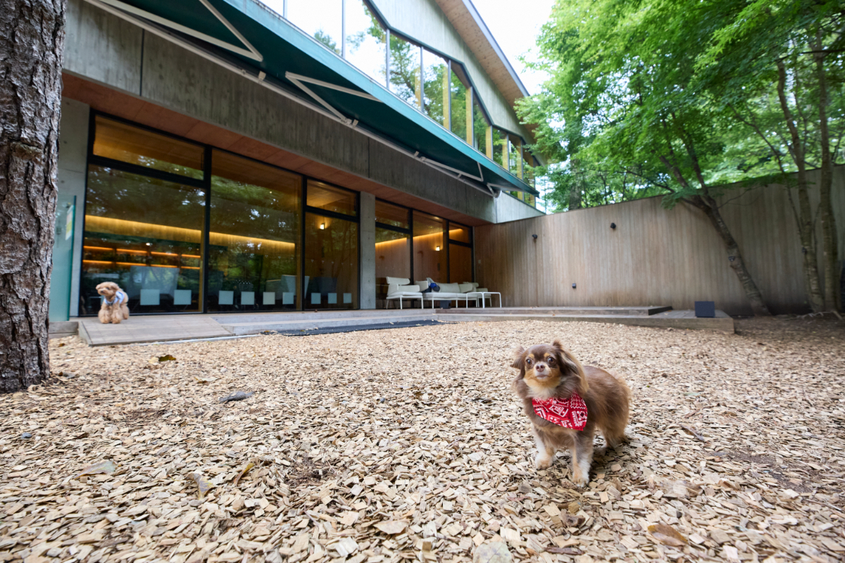 ロビーを抜けると、緑に囲まれた開放的なドッグランが広がります。澄んだ軽井沢の空気を感じながら、思いきり走ったり、ベンチでのんびりしたり。愛犬の個性に合わせて、自由な時間を過ごせます。