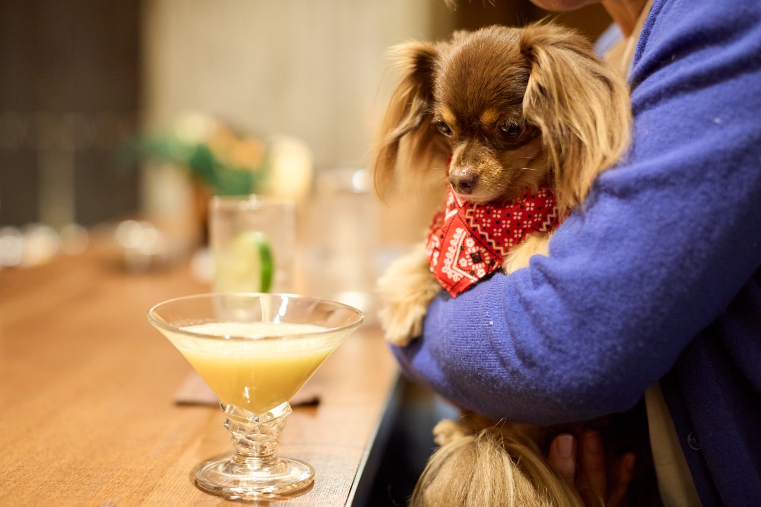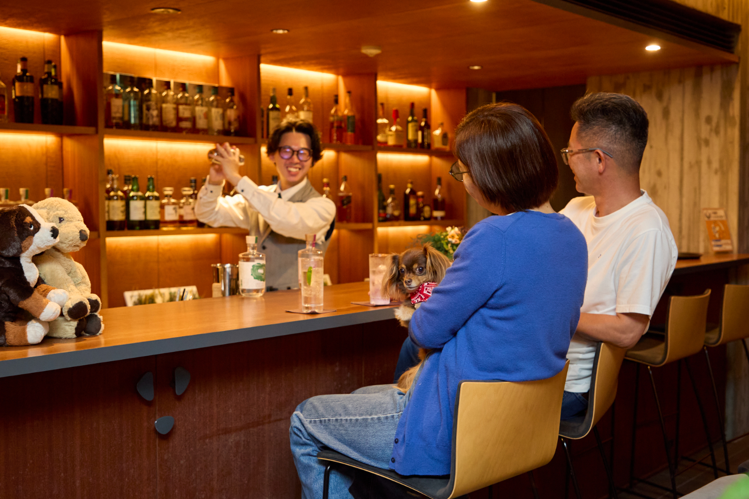 1階のラウンジでは、昼はティータイム、夜はバータイムを。暖炉のある上質な空間で愛犬と一緒にゆったり贅沢なひとときを過ごせます。ワンちゃん専用のカクテルもあり、ちゃちゃちゃんは、マンゴーカクテル風ドリンクを楽しみました。