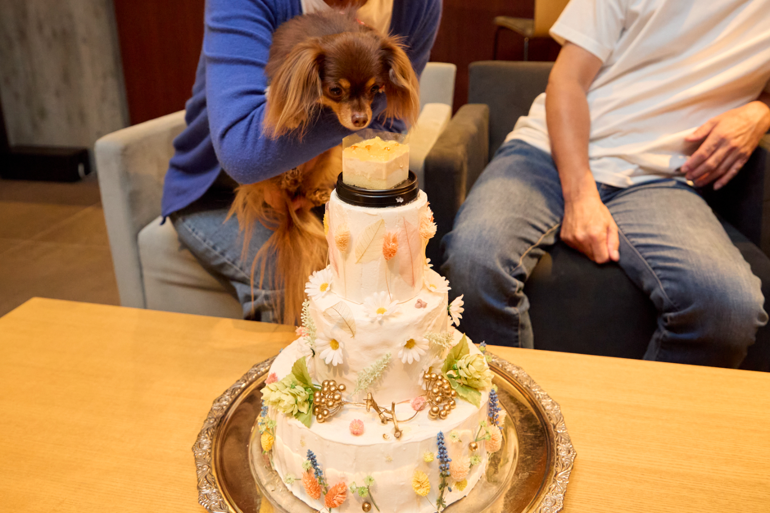 愛犬のお誕生日前後2週間以内に宿泊すると、バースデーケーキとオリジナルフレーム入りの記念写真をプレゼント。家族みんなの大切な記念日を華やかに彩ります。
