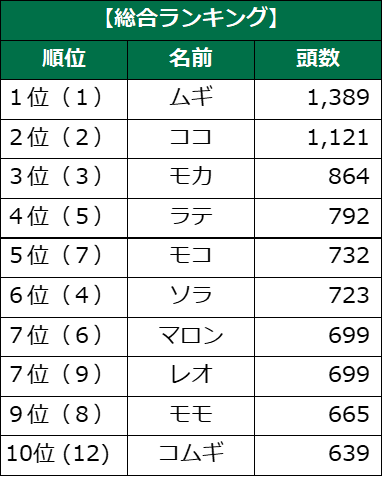 総合ランキングでは、「ムギ」が5年連続で1位となり、5連覇を達成しました。2位は「ココ」、3位は「モカ」と昨年と同じ顔ぶれが続いています。4位の「ラテ」は、昨年5位、一昨年8位から着実にランクアップしている人気の名前です。また、昨年12位の「コムギ」が10位に入り、TOP10入りを果たしました。