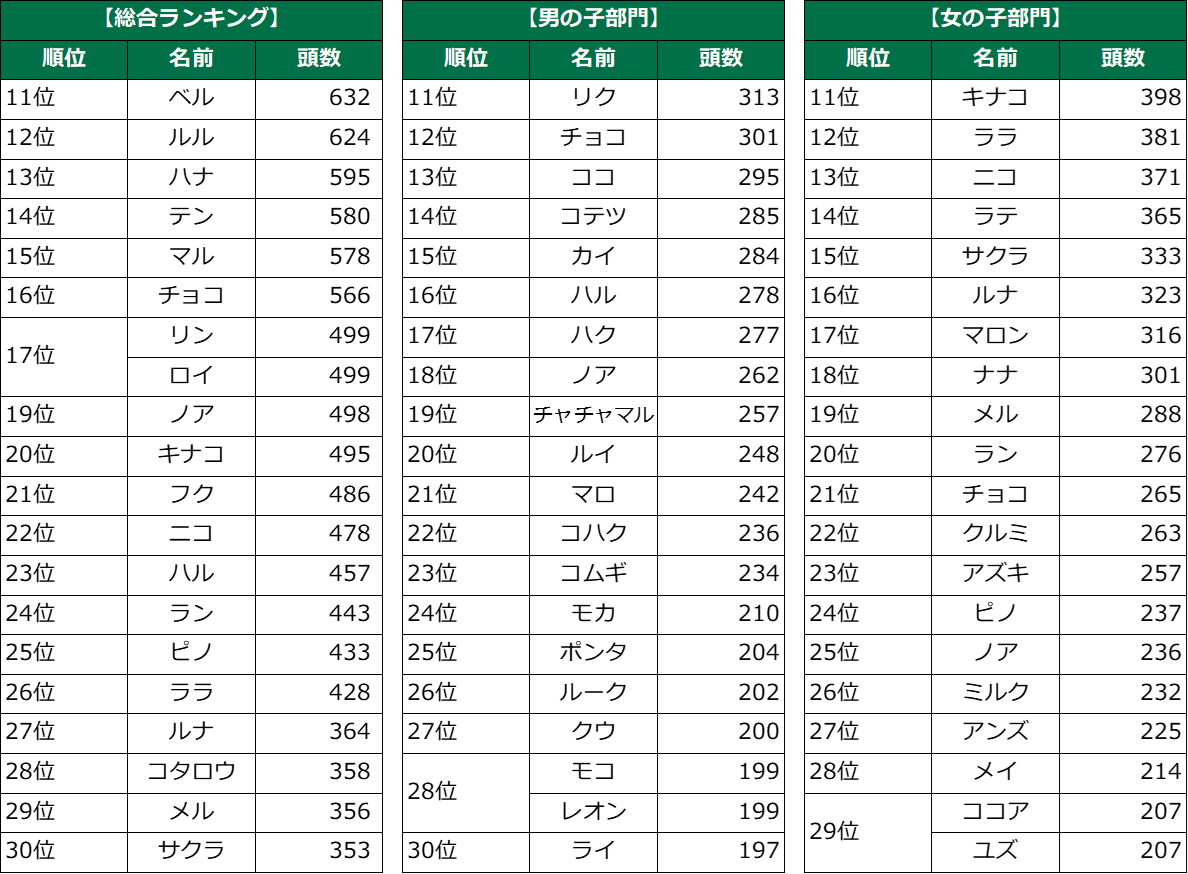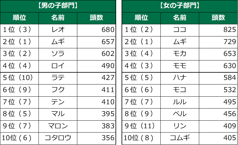 女の子部門では、昨年2位の「ココ」が今年は1位に。2位には「ムギ」、3位には昨年4位の「モカ」が続き、こちらもおなじみの名前が並びました。また、昨年11位の「リン」が9位にランクインし、人気が高まっています。