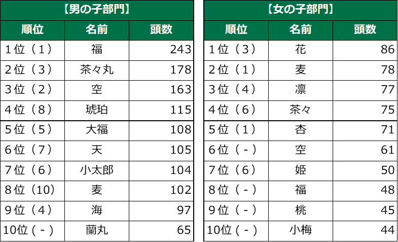 男の子では「福」が昨年に続き1位となりました。2位には昨年3位の「茶々丸」がランクイン。「琥珀」が昨年8位から4位へ、「麦」が10位から8位へと順位を上げました。また、「蘭丸」がTOP10入りを果たしています。