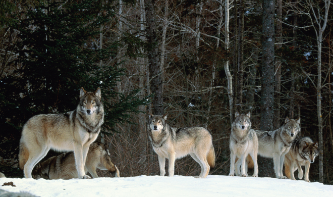 平均5~10頭の群れで生活し、狩りも仲間と協力して行います。おもな獲物はシカやヘラジカ、カリブー、バイソンなど蹄のある大型の草食動物。ビーバーやノウサギ、ネズミなど中~小型のほ乳類や鳥、は虫類、魚、果物を食べて足りない分を補うこともあります。群れごとに縄張りの範囲が決まっていて、その中で狩りをして洞窟や地面に掘った穴をねぐらにします。冬眠はしません。天敵がいない頂点捕食者で、生態系のバランスを保つためにとても重要な存在です。