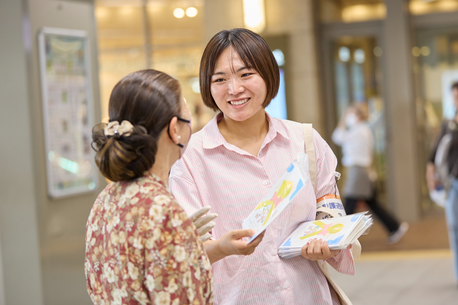 今回は、ノベルティの配布やアンケートを通して、受け取ってくださった方々と対話をしながら、イエローリボンについての啓発活動を行いました。多くの方が声をかけてくださり、その場で足を止めてポストカードに目を通すなど、活動に関心を寄せてくださいました。