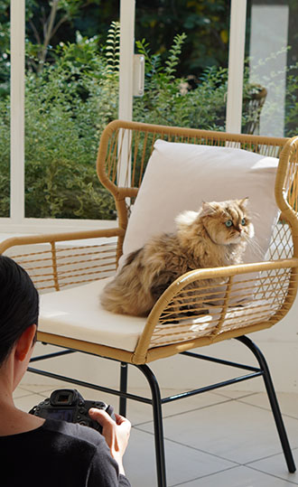 日頃から外をお散歩したりカフェで撮影会に参加したりと、おでかけを楽しんでいる幸福(ふく)ちゃんは、白書の撮影でも到着してすぐにスタジオの中をマイペースにお散歩。まるで自分のおうちにいるかのような、自然な姿を撮らせてくれました。