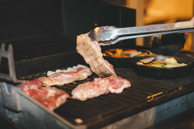 各部屋でいただくディナーは、プレミアムバーベキュー。茨城県名物の常陸牛をはじめ、熟成肉や新鮮な野菜を豪快に焼き上げます。魚介ブイヤベースや筑波ハムなど、茨城の豊かな山と海の幸を味わい尽くし、参加者もみなさん大満足の様子です。