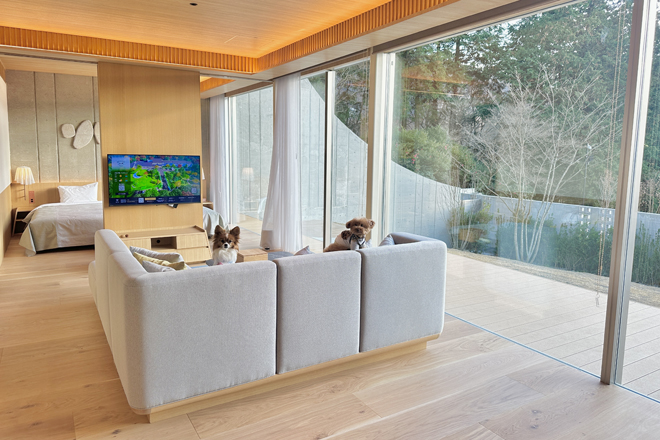 愛犬と泊まれる宿の多くが、どこかに“ガマン”をしなくてはいけない部分がある中、『リトナ箱根』ではほぼ制限ゼロ。ベッドもソファーもお風呂場まで(湯船の中はNG)も一緒にいられるという、愛犬家にとってのサンクチュアリがここにありました。愛犬も飼い主も最大級のおもてなしで迎え入れてくれる『リトナ箱根』。特別な記念日のお祝いとしてもぴったりです。