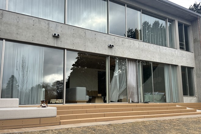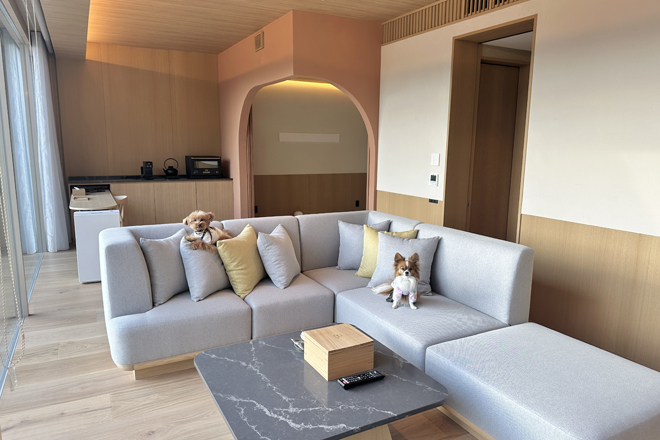 『リトナ箱根』のゲストルームはわずか15部屋。プライベートドッグランがついた1階、眺望のいい2階にそれぞれデラックス、ラグジュアリー、プレミアムスイートのカテゴリーのお部屋があり、さらに1室のみの離れも用意されています。今回、取材班が泊まったのは104号室“ラグジュアリーAタイプ”というお部屋。開放感あるリビングを中心にベッドルームと和室が隣接し、廊下の先にバスルームがあるというとても使い勝手のいいお部屋でした。
