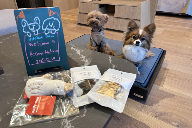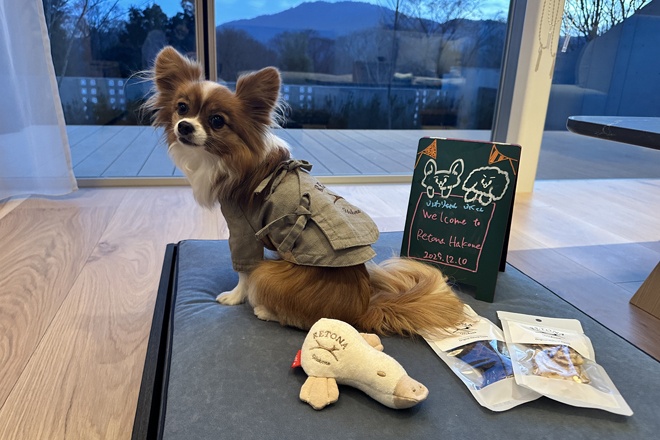 お部屋に用意されていたのが愛犬たちの名前とイラストが描かれたウェルカムボード。さらにチェックイン時にはおやつとおもちゃのプレゼントもあり、愛犬たちも大喜び!おもちゃはゲストルームにつきひとつなので仲良く遊んでくださいね。そして注目なのが愛犬が着ているオリジナルの館内着。飼い主と同じものをワンちゃんサイズに仕立てたここでしか着られない特別な1着は、記念撮影必須のかわいさです。