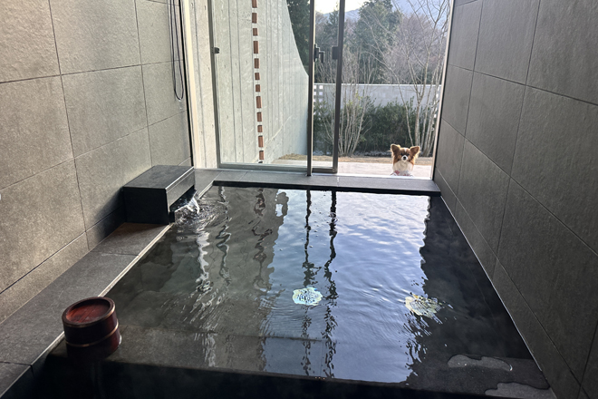 『リトナ箱根』のすべてのゲストルームには温泉が配湯されていて、いつでも好きな時に好きなだけ温泉を堪能できるのも大きな魅力。取材班が泊まった部屋のお風呂は窓を開ければドッグランが眺められる造りだったので、愛犬が走る様子を見ながら温泉につかるという特別感を味わえました。大浴場はありませんが、その分、愛犬と離れることなくずっと一緒に過ごせるのは贅沢すぎる時間だと思いませんか?