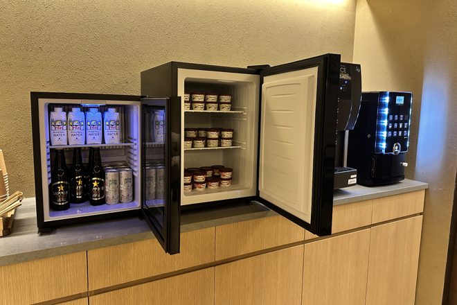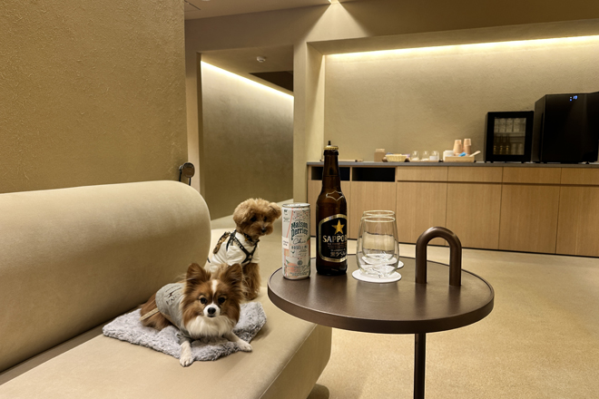 『リトナ箱根』の魅力はゲストルームだけではありません。どこでも愛犬と一緒にいられる館内には愛犬も飼い主もよろこぶサービスがあちこちに!そのひとつがロビー脇にあるラウンジです。ここにはコーヒーや紅茶に加え、ビールやノンアルコールカクテルの用意があり、滞在中ならいつでも好きなだけいただくことができます。さらにアイスクリームも食べ放題なんて贅沢ですよね。(時間によって提供されるものが変わります)