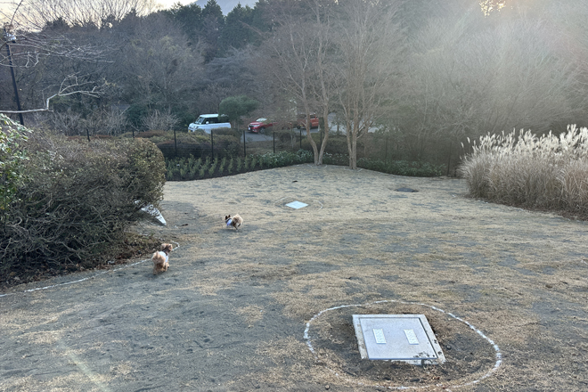 ホテルの外に広がるのがドッグパーク。月型のプールがアイコニックなドッグパークは関東最大級の広さを誇ります。大型犬と小型犬用に分かれていますが、この日はほかにゲストがいなかったので小型犬2頭でドッグパークをふたり占め!絶妙な起伏が楽しかったのか、普段あまり走らないスタッフ犬も、ものすごいスピードで猛ダッシュ。楽しそうな姿に胸が熱くなりました。将来はもっと綺麗に芝生が生えそろってさらに快適なドッグランとなりそうです。