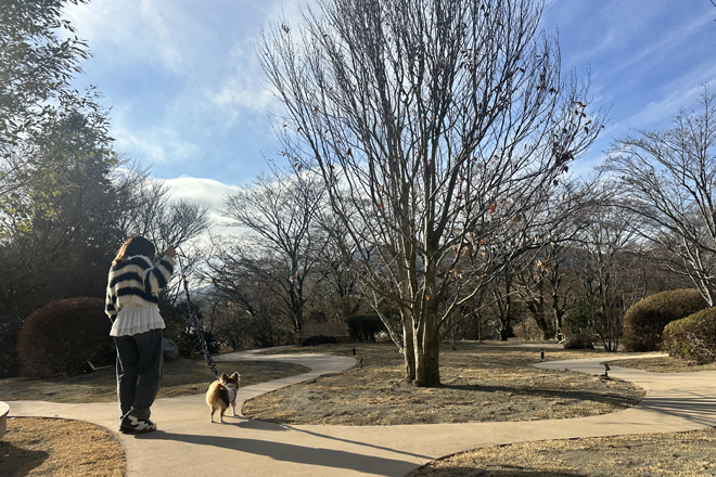 ドッグパークの反対側にはリード着用でお散歩が楽しめるドッグガーデンを併設。ドッグランは夜中は使えませんが、こちらは夜もライトアップされるので、好きな時間にお散歩できるのが魅力です。ロビー入り口やドッグラン入り口にはトイレ袋などのアメニティも用意されているので、外でしかおトイレができない子にもこのスペースは助かると思いました。