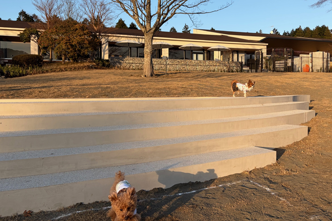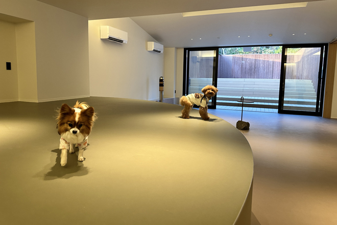 館内にもドッグランが用意されているので、天候に左右されず愛犬を遊ばせてあげられるのも『リトナ箱根』の大きなポイント。地形を見立てた起伏あるデザインや、テラスにも出られる造りが愛犬の探究心をくすぐるのか、2頭はあちこち思い思いに探検を楽しんでいました。