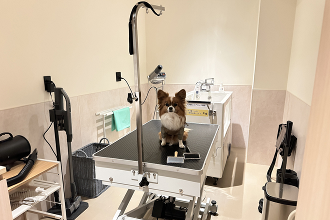 室内ランの隣には本格的なグルーミングルームが2部屋用意されていて、ゲストなら無料で使うことができます。マイクロシャワーがついたバスタブにくわえ、昇降式のトリミング台、ブロアーにブラシまでフルセットで用意された空間はプロ仕様のトリミングサロンそのもの!利用は予約制なので、希望する方は早めに予約するのがおすすめです。