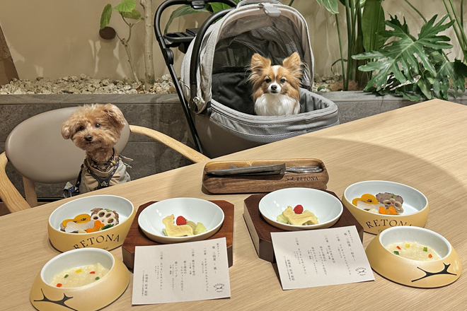 思い切り遊んで腹ペコな愛犬たちが一番楽しみにしていたのが食事の時間!『リトナ箱根』では“離れ”のお部屋以外のゲストはダイニングでお食事をいただきます。すべてが個室もしくはパーテーションで区切られたプライベート空間になっているのでほかのゲストの目を気にすることなく、ゆったりと食事が楽しめるようになっているのが大きなポイント。また、高級ペットカートのレンタルも無料なので愛犬と並んで食事ができるのも嬉しい心遣いです。
