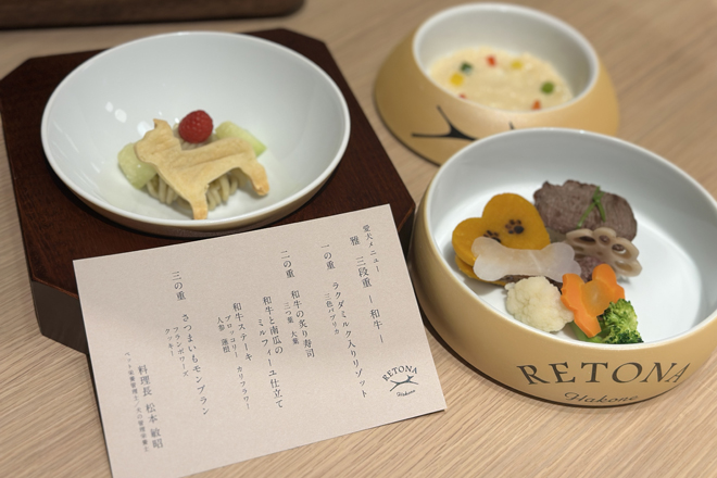驚いたのがワンちゃんのお料理の豪華さです。オリジナルで作られた円形のお重を開けると、ラクダミルクのリゾット、メイン料理、デザートが登場!『リトナ箱根』開業のために犬の栄養士の資格を取得した料理長が腕を振るった美しいお料理がずらりと並び、愛犬たちも目をキラキラ輝かせていました。