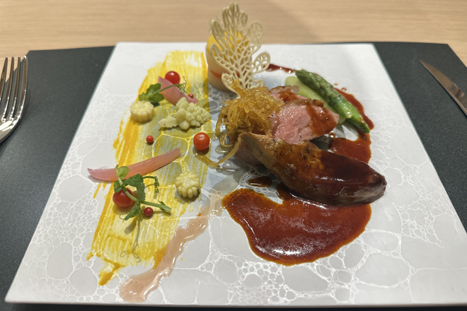 飼い主のお料理は、箱根西麓野菜や神奈川県産のブランド和牛・大山阿夫利牛を使い、日本料理を現代的なコースに仕上げた「モダン懐石」です。器にもこだわった鮮やかなお料理たちが目も楽しませてくれました。メインは3種類からチョイスできるので、その日の気分で食べたいものが食べられるのもお楽しみのひとつ。この日は鴨肉を選ぶと、大きなフォアグラつき!お料理に合わせたワインも豊富に揃っているのでぜひマリアージュを楽しんでくださいね。