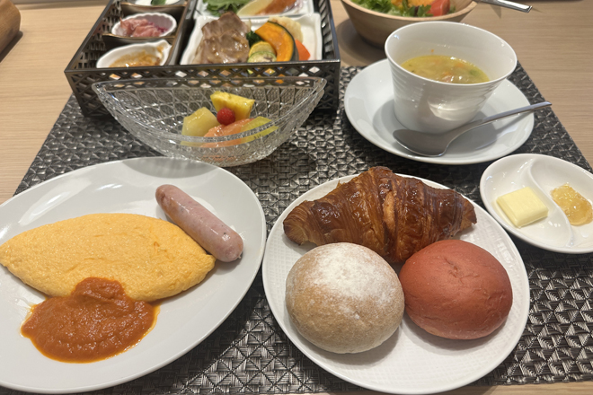 朝ごはんは和定食か洋食からチョイスすることができます。洋食のメインは卵をたっぷり使ったオムレツと熱々の3種類のパン。さらに副菜も豪華で朝からお腹がいっぱいに!ワンちゃんにもラクダミルクと豆腐ハンバーグなどヘルシーなものが用意されていて、朝からご満悦の様子でした。