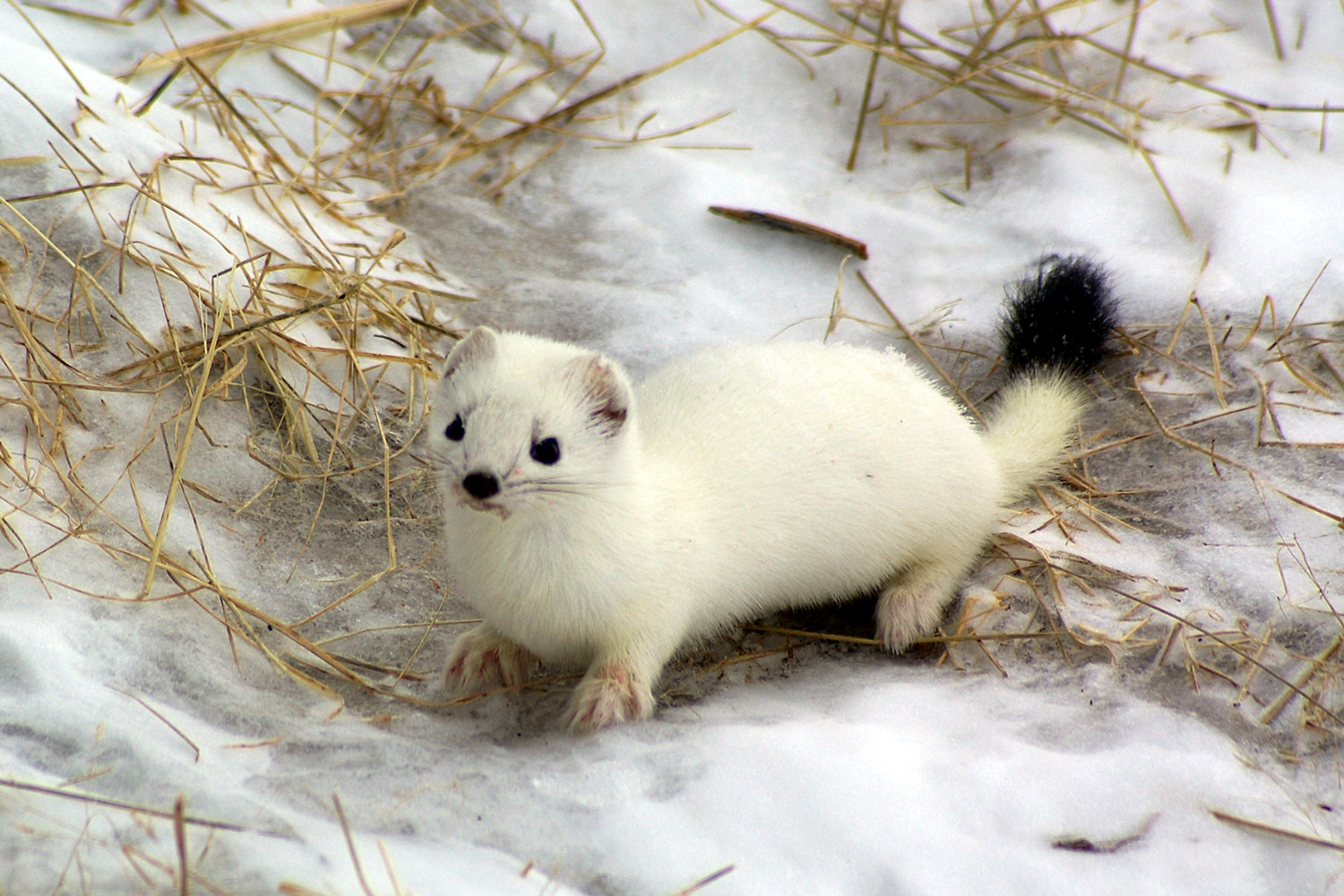 オコジョというと、どんな色が思い浮かぶでしょうか。白?それとも茶色?色が違うと種類も違うのでしょうか。実はどちらも同じオコジョ。1年に2回換毛期があり、夏毛と冬毛で毛の色が異なります。夏毛は背側がチョコレートのような茶色で、お腹側が白です。冬毛に変わると全身が真っ白に。ただし、しっぽの先だけは一年中黒いままです。