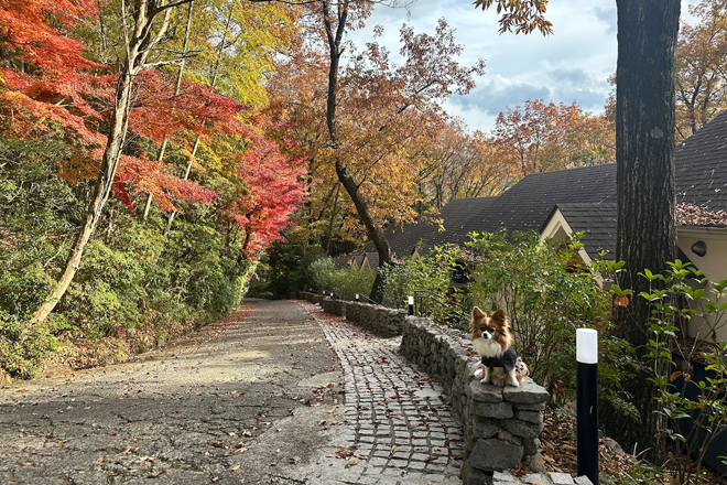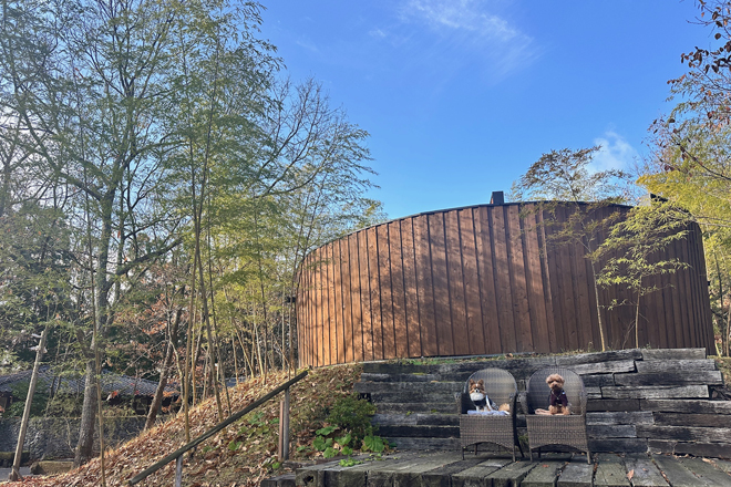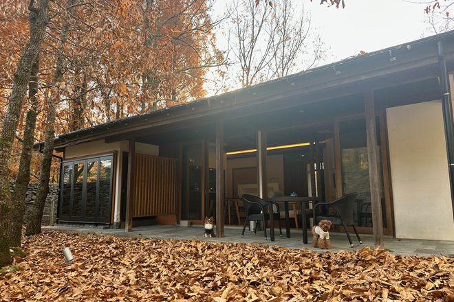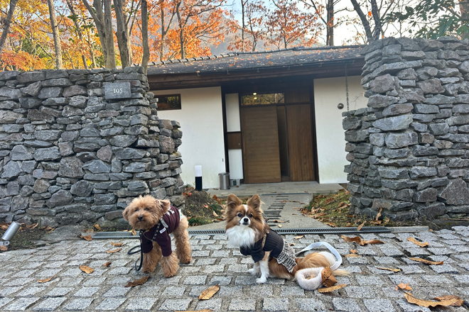 今回、取材班が泊まったのは8棟あるヴィラの中でも一番広いドッグランのある「ヴィラスイートFタイプ(105号室)」というお部屋。客室は82㎡、ドッグランはなんと162㎡もあり、小型犬2頭で遊ぶには贅沢すぎるスペースです。お庭を埋め尽くす大量の落ち葉はふかふかで、まるで落ち葉のお風呂(笑)。ときどき溺れそうになりながらも、ぴょんぴょんと飛び跳ねて遊ぶ愛犬たちの姿がほほえましかったです。