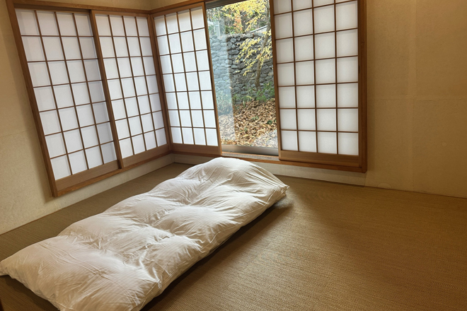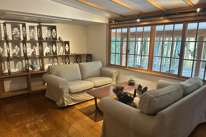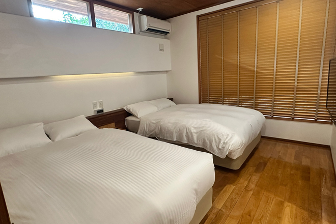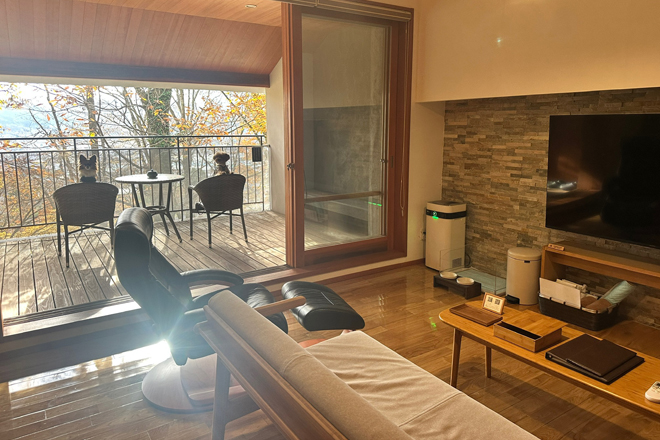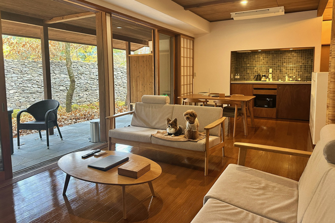 お部屋は和洋室タイプになっていて、リビングを中央に、左右にベッドルームと和室が分かれています。ベッドは2台、お布団が2組用意されているので最大4名まで宿泊可能。犬友との旅行だけでなく、シニア世代との2世代旅行にもぴったりだと思います。