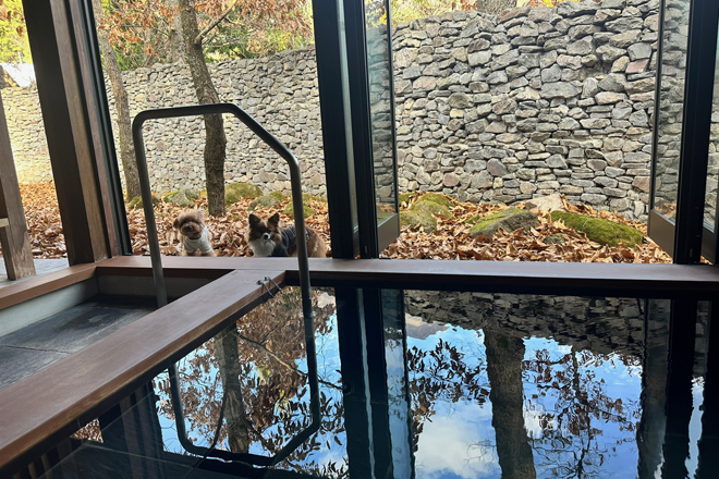 さらに別料金で利用できる貸切風呂も3つ用意されていて、こちらはチェックイン前後でも利用できるのが魅力。愛犬は脱衣所まで同伴でき、ケージが用意されているので入浴中も安心という心遣いも嬉しいです。