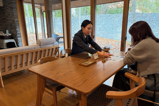 取材班が訪れたのは、まだ紅葉の名残が感じられる季節。美しい木々に囲まれたリゾートは、まるでそこだけが独立した村のような佇まいです。その中心に建っているのがフロントの建物。一歩足を踏み入れると、大きな梁や歴史を感じさせる調度品の数々が目に飛び込んできます。それもそのはず、実はこの建物、別の場所から移築されたもので、建てられたのは今から約270年前。長い時を重ねてきた趣が、空間の随所に息づいています。