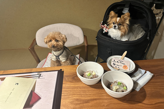 驚いたのが愛犬メニューの豪華さ。これまで取材したお宿は多くても4、5種類のメニューでしたが、ここではなんと15種類以上! チキンや馬肉、お野菜などに加え、フグや由布院サーモンといった大分ならではの食材を使った愛犬メニューも用意されています。愛犬たちがあっという間に完食したことは…言うまでもありませんね。