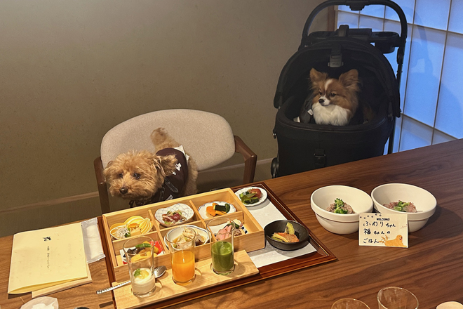 朝食も同じ場所で、和食のメニューをいただきました。団子汁や自家製の竹豆腐、りゅうきゅうといった大分ならではのメニューにわくわくが止まりません。リクエストすれば納豆やお海苔もいただけるので、ついついご飯が進んでしまうこと間違いなし。もちろん、愛犬たちもぺろりと完食、満足げなお顔でお食事を終えたのでした。